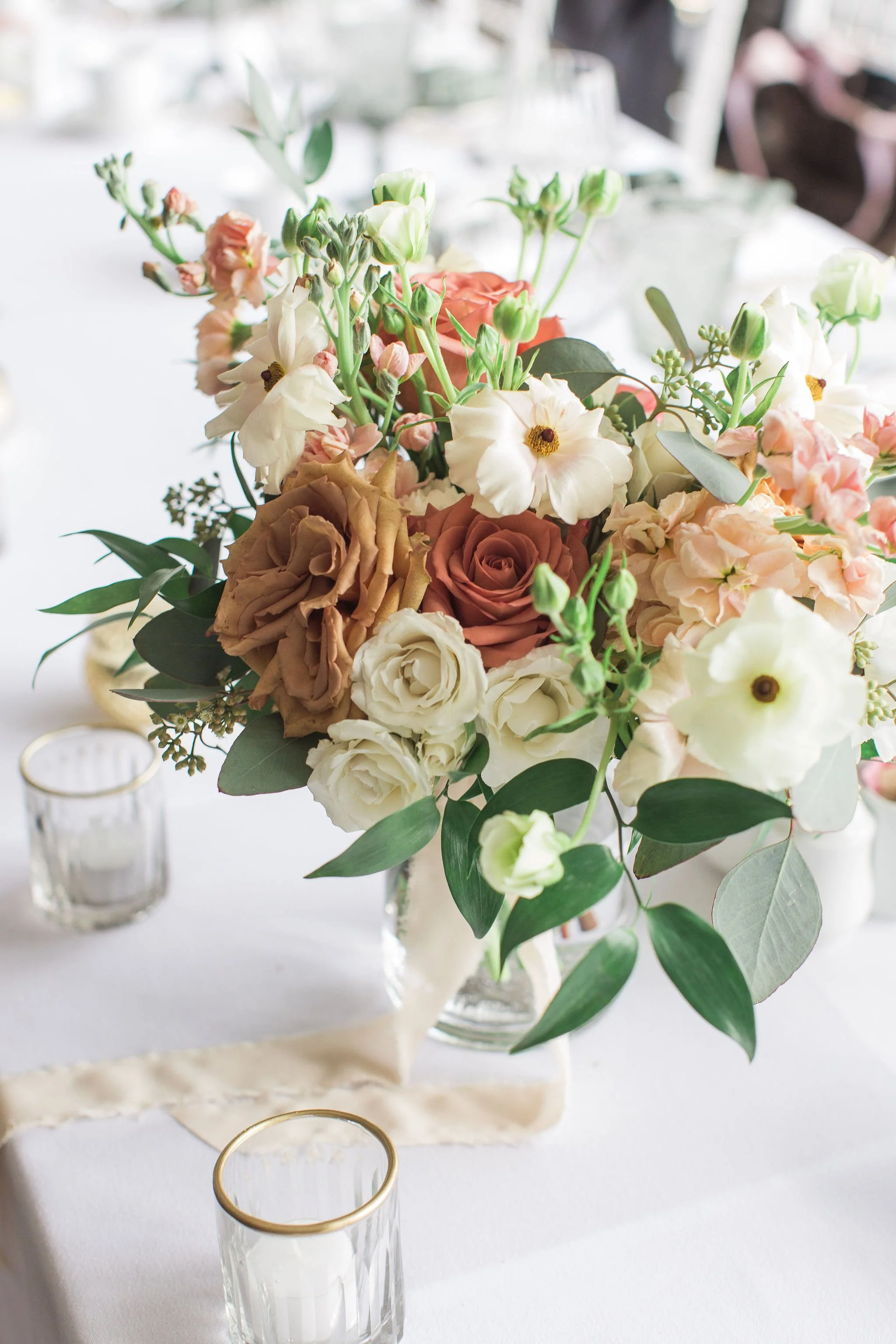 By the time guests arrived at Le Belvedere Wakefield, the venue was dressed in a stunning spring palette of sage green, toffee, and dusty rose florals. The colours felt soft and grounded while still bringing warmth and richness to the mountain setting. One of the most striking design moments was the six-foot hanging floral chandelier, suspended above the reception space like a floating garden. It created an incredible focal point and brought movement, texture, and a whimsical sense of drama to the room.